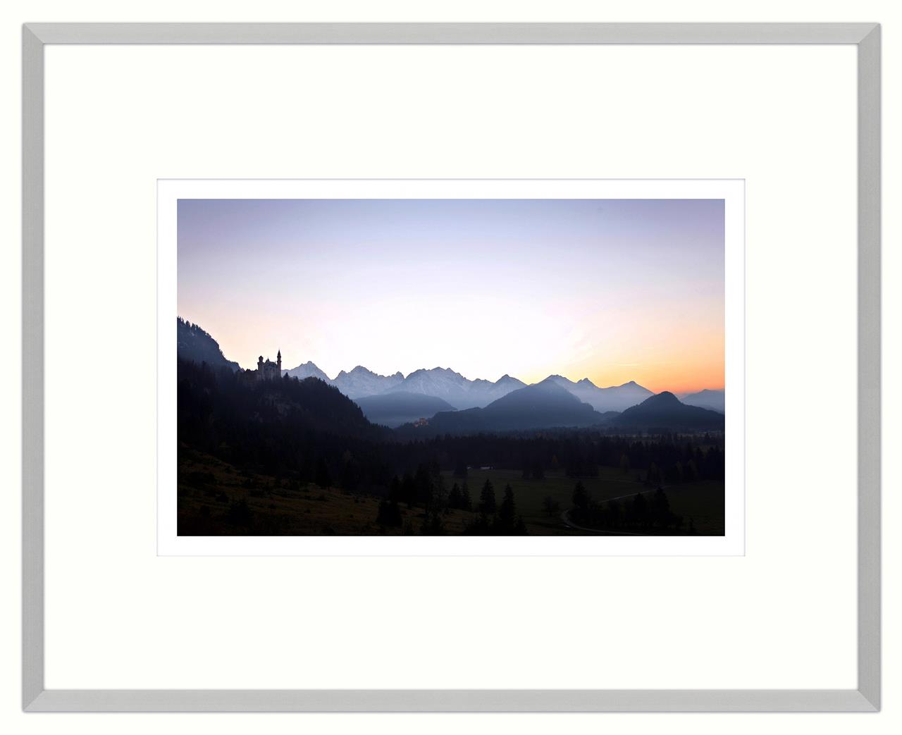 Das Foto bietet einen bezaubernden Blick auf den Königswinkel bei Füssen in Schwaben. Im Abenddunst eingehüllt erstreckt sich die Landschaft, geprägt von den imposanten Schlössern Neuschwanstein und Hohenschwangau. Eine zauberhafte Mischung aus Sonnenschein und Hochnebel prägt das Wetterund verleiht der Szenerie eine mystische Atmosphäre. Die majestätischen Silhouetten der Schlösser ragen stolz in den Himmel, während die sanften Hügel und Wälder die Umgebung umrahmen. Dieses fesselnde Bild fängt die Schönheit und den Zauber des Königswinkels in einem einzigartigen Moment ein.