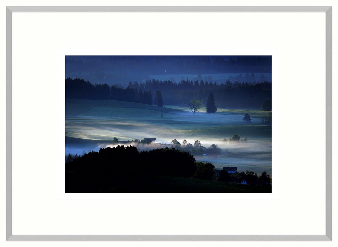 Eine weite Wiese liegt unter einem flachen Nebelbett, das sie sanft umhüllt. Das Licht der aufgehenden Sonne färbt den Nebel und die Landschaft in ein ruhiges Blau. Die Szenerie strahlt eine beruhigende und friedliche Atmosphäre aus, während der Nebel die Konturen der Bäume und Hügel sanft verhüllt. Diese stille Morgenstimmung im Alpenvorland vermittelt eine unvergleichliche Ruhe und lädt den Betrachter ein, die Schönheit der Natur zu genießen.